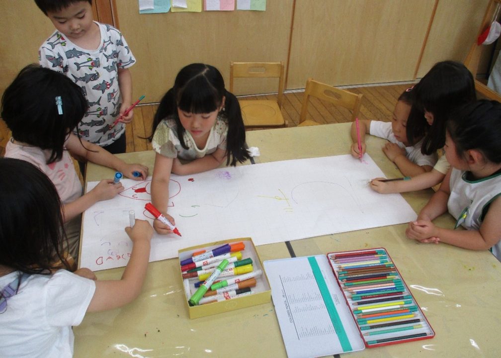 6月に入ってすぐ、夕涼み会の準備が始まりました。最初に、「みんなが年中組のときに、夕方に来てお買い物したの覚えてる?」と聞くとほとんどの子が覚えていて「宝石を貰った!」「アイスのうちわを作った!」と教えてくれました。「今度はみんながお店屋さんをするよ」と伝えるとやったー!と大盛り上がりでした。 おかし・ジュースやさん、うちわやさん、てづくりひんやさん、ゲームコーナーの4つの中から子どもたちが自分でやりたいお店を選んで決めました。