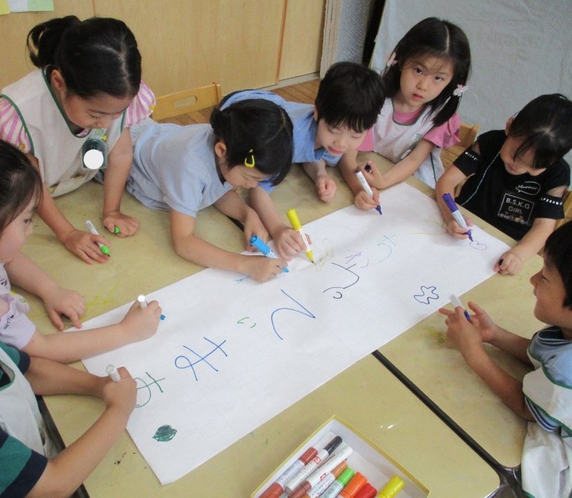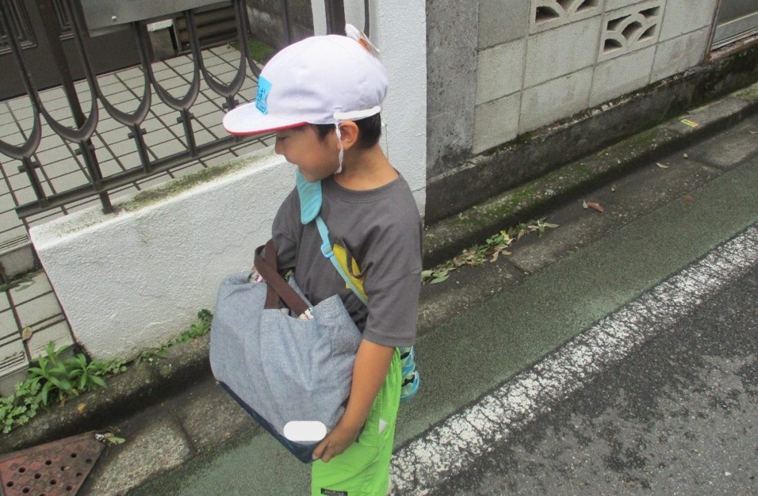 おかし・ジュースやさんの話し合いは、他の係の準備が始まってから少し経ってからだったので、「まだおかし・ジュース屋さんやらないの?」とはやく準備をしたい様子で、話し合いをとても楽しみにしていました。20種類のお菓子の中から何にするかを話し合い、5種類のお菓子に決まり、決まったお菓子を袋に入れてラッピングをしました。おかしやさん8人で、150人分のお菓子をラッピングするのは大変でしたが、1つ1つ丁寧に袋に入れていました。また、おかし・ジュースやさんは、ジュースを買いに生協まで行くお仕事も行いました。行きはルンルンだった子どもたちでしたが、1人で18人分のジュースを持ってみると、あまりの重さにびっくり。最初は「持てない」「重すぎるよ」と言っていましたが、肩から掛けたり両手で鞄を抱えたりして、暑い中汗だくだくになりながらも頑張って運びました。生協からの帰り道で3回休憩し、体操をしたりお茶を飲んだりしていると、幼稚園が見えてきて元気を取り戻し、最後の角を曲がると「かるい!かるい!」と言いながら自分たちで鼓舞している姿もあり、子どもたちだけで幼稚園に運びました。時間にすると1時間くらいの準備でしたが、重くて大変だったからこそ心に残った時間だったのではないかと思います。