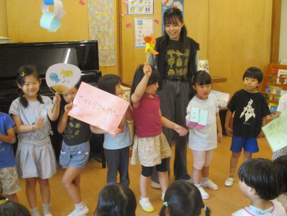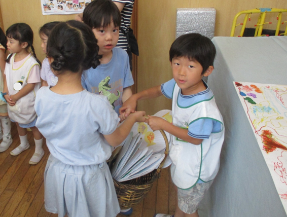うちわを作ってくれる年中組に「うちわ一緒に作ってくれませんか?」とお願いに行きました。年中組の前に立ってお願いするのはとてもどきどきしていて、1回目は小さな声になったけれど、もう一度勇気を出して大きな声で伝えてみると「いいよ!」「ハートのかわいいの作る!」「俺は簡単に作れるから」などと言ってくれた年中組の子を見て安心した様子でした。何日かして「うちわが出来上がりました」と年中組の子が持ってきてくれたときも、お願いしたうちわができたことを喜んでいました。また、うちわやさんは、てづくりひんやさんと一緒に手作り品を何にするかを話し合ったり当日のアナウンスの練習をしたりして準備しました。お店屋さんを一緒にする友だちと読む部分を一緒に決めて、何度も自分のところを練習していました。当日も自分のところのアナウンスを読み、拍手をもらって嬉しそうな顔が見られました。