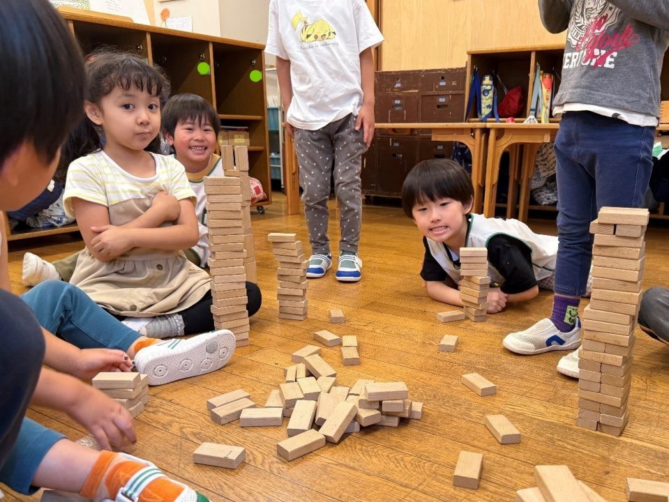 ゲームコーナーは、何のゲームにするかの相談からはじまり、ルールやお約束、景品なども全部子どもたちだけで話し合って決めました。ゲームコーナー係の子たちは人数が多かったのですが、話し合いだよと伝えると遊びの途中でもすぐに集まり準備を進めていきました。色々な意見をもっている子が多く、何のゲームにするかの話し合いでは、魚釣り、ホラーゲーム、水鉄砲、射的、的当て、ボーリングなど様々な意見が出ました。決める方法をどうするかの話し合いではじゃんけん、多いもの勝ち、かけっこ、にらめっこ、くじ、あみだくじ、など様々な意見の中で、かけっこで決めることになり、全員で走って一番早かったAさんが射的にすることを決めました。どんな射的にするかも話し合い、積み木を一番t角積み上げた人が決める、という方法で、段ボールの的をロケットランチャーで撃つことになりました。