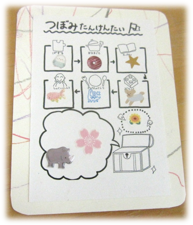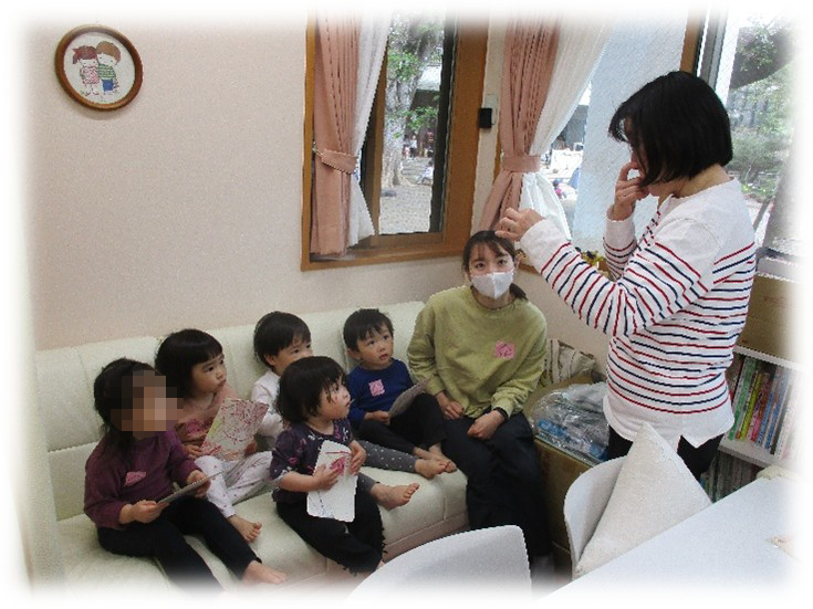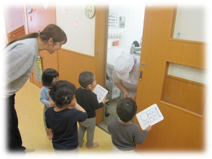お部屋の中のままごと・絵本・パズル・ブロックなどのコーナーや給食室、職員室にも探検に行きました。 最後には職員室に行って園長先生からシールをもらって嬉しそうな子どもたちです。楽しかったですね。